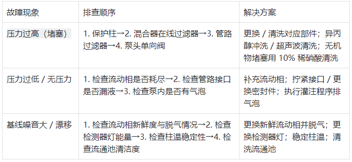 气泡是泵和输液系统的 “大敌”,必须提前预防、及时排除。输液前一定要把流动相充分脱气,要是发现管路里有气泡,赶紧用注射器抽吸把气泡赶出去;如果泵压力不稳、流速也不稳定,大概率是泵里进了气泡,这时候执行灌注 /purge 操作就能解决。?