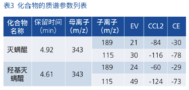 采用 EClassical 3200L-MS2 Vertical 9100 三重四极杆液质联用系统进行分析,离子源参数及目标化合物质谱参数见表 2 和表 3。