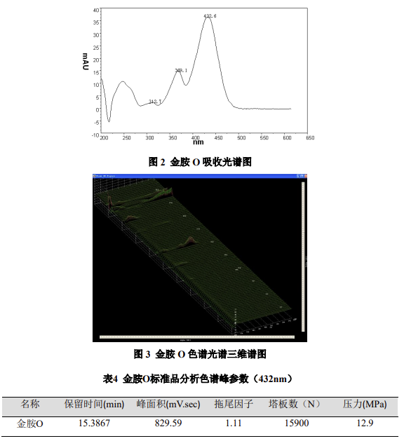 按照《中药材及中药饮片药品检验补充检验方法和检验项目批准件》食药监稽函 [2012] 200 号文件中金胺 O 检测方法,使用大连依利特分析仪器有限公司配置 DAD230 + 二极管阵列检测器的高效液相色谱仪可以分析检测中药材和中药饮片中的金胺 O,系统稳定重复,线性相关性良好,检出限低,通过光谱图比对、峰纯度计算功能,能够准确定性,避免假阳性现象,满足药监部门制定的标准要求。