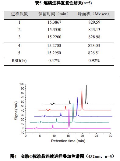连续进样 5 次,计算金胺 O 色谱峰保留时间和峰面积的 RSD 值,均小于 1%。