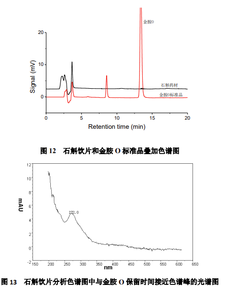 峰,说明该 5 种药材中不含有金胺 O。石斛分析谱图与金胺 O 标准品保留时间一致处,有一个色谱峰 (峰高 0.19mV),提取该色谱峰光谱图 (图 13),与金胺 O 光谱图不一致,说明该色谱峰不是金胺 O。