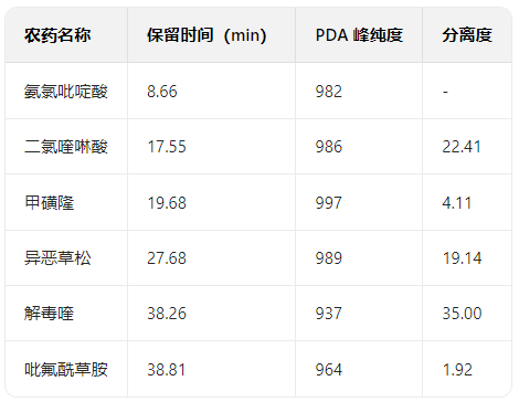 6 种农药实现基线分离,分离度均>1.5,峰纯度优异,关键参数如下: