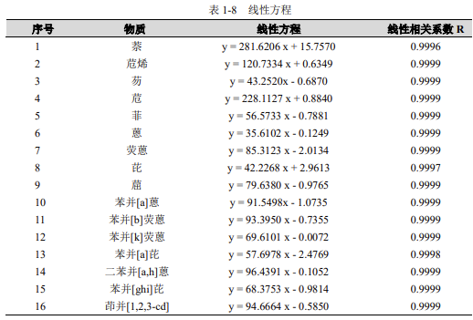 将 16 种多环芳烃标准工作液,按 1.3.2 中色谱条件进行分析,16 种多环芳烃线性如下表所示: