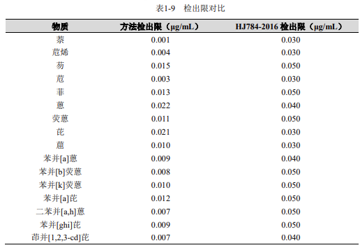 以 3 倍信噪比对应的浓度换算为仪器的检出限,以 10 倍信噪比对应的浓度为仪器的定量限。计算 16 种多环芳烃的检出限,并推出 16 种多环芳烃的方法检出限结果如下表所示: