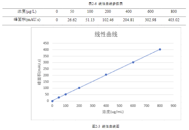 所得曲线方程为 y=0.5034 x+1.2352,r=0.9999,大于 0.9995,在 0-800μg/L 之间具有良好的线性关系。
