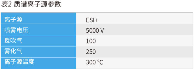 依利特 EClassical 3200L-MS2 Vertical 9100 三重四极杆液质联用系统进行分析,离子源参数及目标化合物质谱参数见表 2 和表 3。