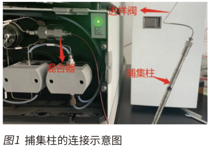 由于该类化合物为增塑剂,部分待测化合物会出现在液相色谱的管路中,形成本底干扰,故在泵的混合器出口后和自动进样器的进样阀前连接一根色谱柱作为捕集柱,可将溶剂中的干扰物与样品瓶中待测物在分析色谱柱上分开,如右图 1 所示。本方法一针进样测定 6 种邻苯二甲酸酯类化合物,图 2 中展示了 6 种化合物的提取离子谱图。可见各个化合物的峰型对称,所有异构体均取得良好的分离,并保证每个色谱峰上有足够的采集点数,以便获得准确的结果及优异的重复性。