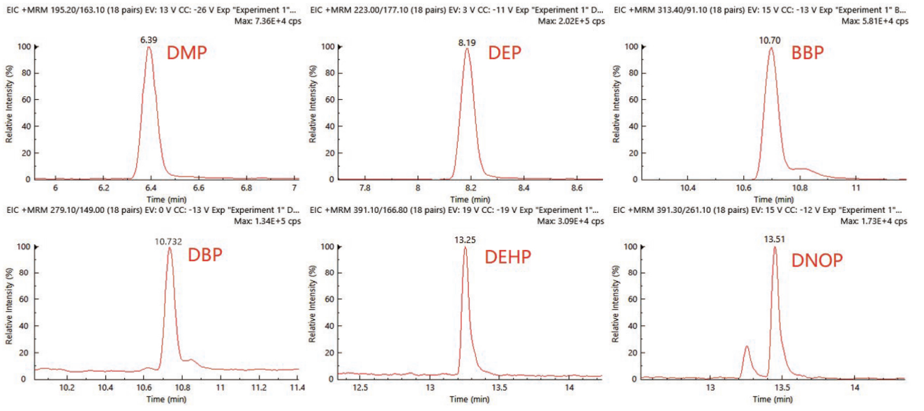 依利特 EClassical 3200L-MS2 Vertical 9100 液相质谱联用系统,成功建立了水质中 6 种邻苯二甲酸酯类化合物的分析方案,根据保留时间及离子比率进行快速准确定性,内标法定量,其检出限完全满足标准中的检测限量要求,轻松应对日常检测分析要求。