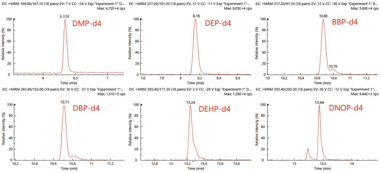 (图 2 6 种邻苯二甲酸酯类化合物及其内标的提取离子色谱图(浓度为 100μg/L):包含 DMP、DEP、BBP、DBP、DEHP、DNOP 及其对应内标 DMP-d4、DEP-d4、BBP-d4、DBP-d4、DEHP-d4、DNOP-d4 的色谱图,横坐标为时间(min),纵坐标为响应值相关参数,图中标注了各化合物及内标的出峰时间,如 DMP 约 6.39min、DEP 约 8.19min、BBP 约 10.70min、DBP 约 10.732min、DEHP 约 13.25min、DNOP 约 13.51min 等,内标出峰时间与对应化合物相近)