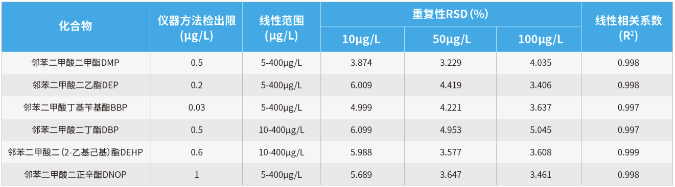 本文采用 EClassical 3200L-MS Vertical 9100 三重四极杆液质联用系统建立了快速、高灵敏度和可靠的 LC-MS/MS 实验方法测定水质中 6 种邻苯二甲酸酯类化合物的含量。本方法具有分析速度快、灵敏度高、准确度好等特点,且检出限低于 HJ 1242-2022《水质 6 种邻苯二甲酸酯类化合物的测定 液相色谱 - 三重四极杆质谱法》标准中限量的要求,同时数据显示,其重复性和线性均较好,为后期高通量的样品测定提供可靠的保障。