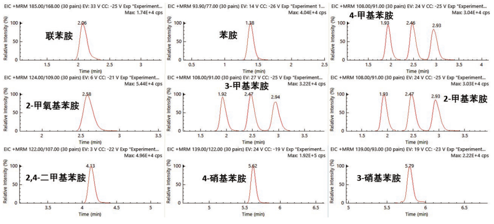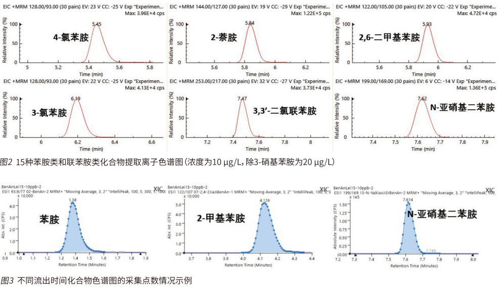 本方法采用一针进样同时测定 13 种苯胺类和 2 种联苯胺类化合物,图 1 和图 2 中分别展示了 15 种化合物的 MRM 叠加谱图和提取离子色谱图??杉鞲龌衔锏姆逍投猿?,所有异构体均取得良好的分离,并保证每个色谱峰上有足够的采集点数,以便获得准确的结果及优异的重复性。