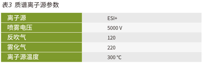 采用 Elite MSVertical 9100 三重四极杆液质联用系统进行分析,离子源参数及目标化合物质谱参数见表 2 和表 3。