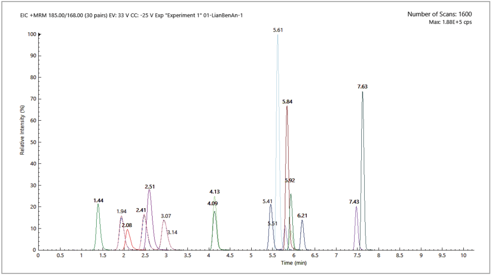 目前,我国生态环境部发布标准 HJ1210-2021《土壤和沉积物 13 种苯胺类和 2 种联苯胺类化合物的测定 液相色谱 - 三重四极杆质谱法》,为环境介质中土壤和沉积物中苯胺类和联苯胺类化合物的测定提供技术保障和法规依据。本文针对该标准,依利特科技采用 EClassical 3200L-MS2 Vertical 9100 液质联用系统,成功建立了土壤和沉积物中 15 种苯胺类和联苯胺类化合物的分析方案,根据保留时间及离子比率进行快速准确定性,其检出限完全满足标准中的检测限量要求,轻松应对日常检测分析要求。