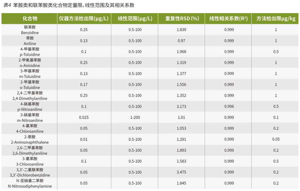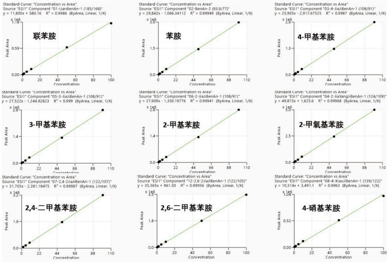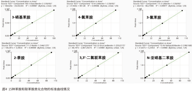 用含 25% 的甲醇水溶液稀释 15 种苯胺类和联苯胺类化合物的混合标准溶液,制成 0.5μg/L-100μg/L 的系列校准标准溶液,其中除 3 - 硝基苯胺为 1μg/L-200μg/L,并绘制标准曲线。图 4 为 15 种化合物的标准曲线情况。其中各个化合物在线性范围内,线性关系均较好,相关系数 R 均大于 0.995。同时考察了仪器方法的检出限及定量限浓度的 6 针重现性测试(见表 4),实验结果表明,该仪器方法对于测定 15 种化合物具有优异的线性及重现性,以及较高的灵敏度。