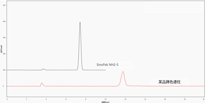 图3. 使用SinoPak NH2-S色谱柱和某品牌氨基柱分析葡萄糖对照品的色谱图
