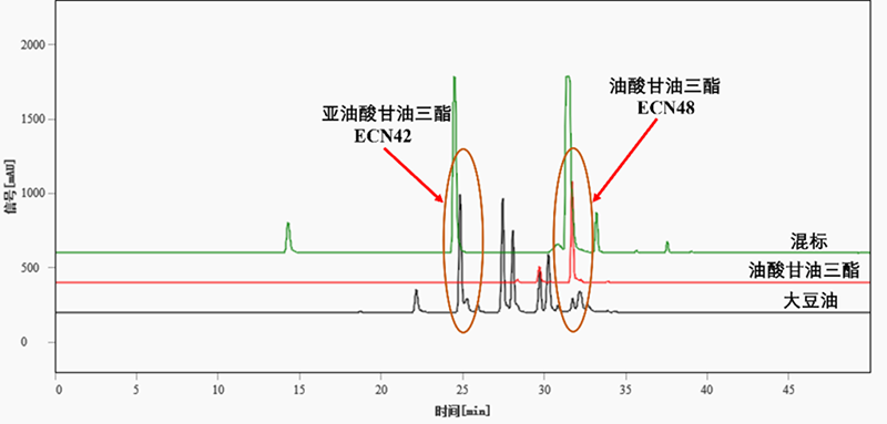 图1. 大豆油样品与油酸甘油三酯标液以及甘油三酯的混标溶液的叠加色谱图
