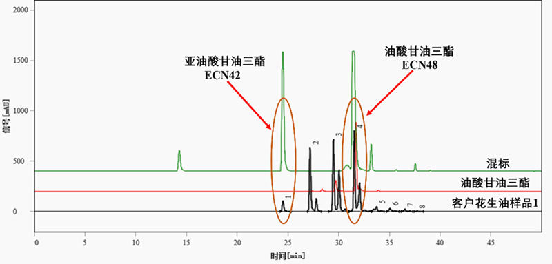图2. 花生油样品与油酸甘油三酯标液以及甘油三酯混标溶液的叠加色谱图