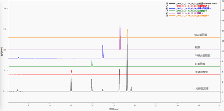 图1显示了人工牛黄胆酸类系统适用性溶液在SinoPak C18色谱柱上的分离色谱图。图中四个色谱峰(依次为?;侵砣パ醯ㄋ?、牛磺胆酸钠、鹅去氧胆酸、脱氧胆酸)基线分离良好,峰形尖锐对称,直观表明该色谱系统对这几类结构相似的化合物具有优异的分离能力。图3为系统适用性溶液及对应单标在SinoPak C18色谱柱上分离的叠加色谱图,进一步证实了系统适用性溶液与对照品溶液中对应峰的一致性。