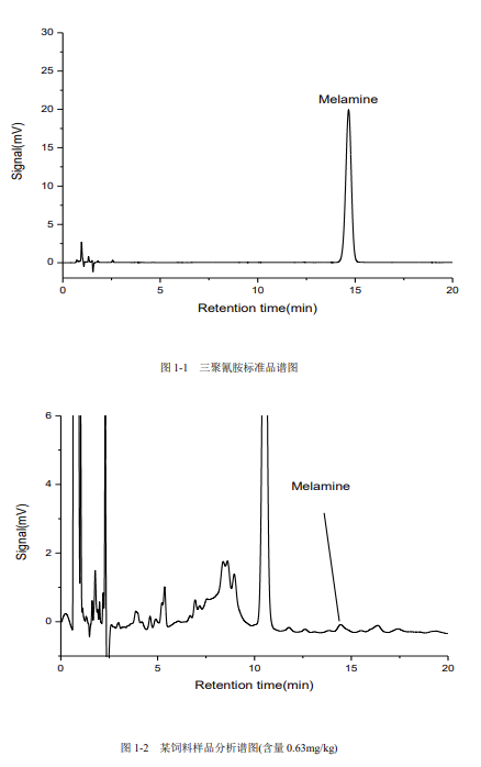 饲料中三聚氰胺经三氯乙酸提取、离心后,经混合型阳离子交换固相萃取柱净化,洗脱物吹干后用流动相溶解,用高效液相色谱仪进行测定。