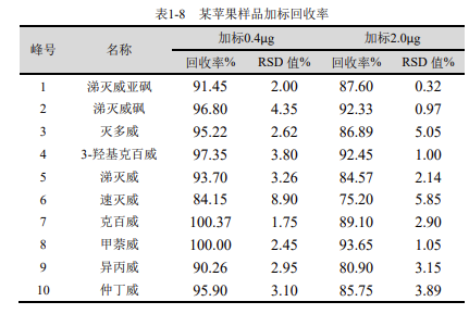 大连依利特分析仪器有限公司,结合《NY/T 761-2008 蔬菜和水果中有机磷、有机氯、拟除虫菊酯和氨基甲酸酯类农药多残留的测定》方法及相关文献中关于农残测定的要求,建立的氨基甲酸酯分析系统,提出了蔬果中氨基甲酸酯类农药残留检测的全套解决方案,并以苹果为样品进行了检测,实验结果能够达到标准中各项指标要求。