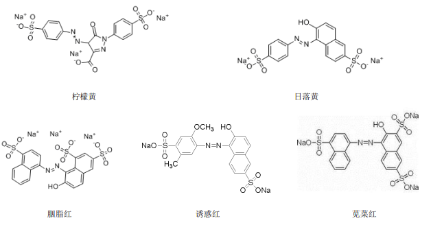 合成着色剂可分为偶氮类和非偶氮类两种结构。在酸碱条件下,两种结构的合成着色剂均稳定。按着色剂的溶解性可分为脂溶性着色剂和水溶性着色剂,脂溶性着色剂由于不溶于水,在体内不易排出,毒性较大等原因,在食品行业已经不允许添加,现在世界各国使用的合成着色剂大部分为水溶性偶氮类着色剂。