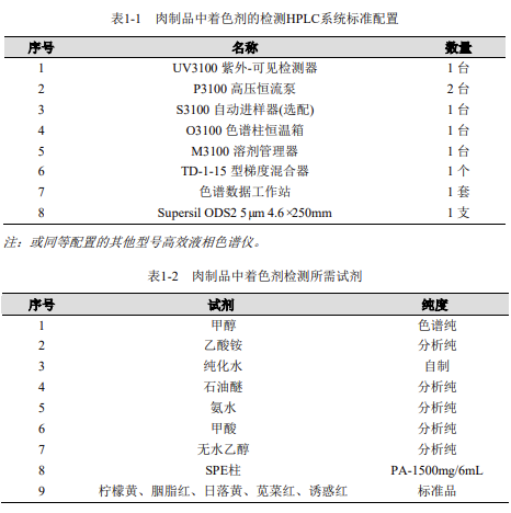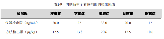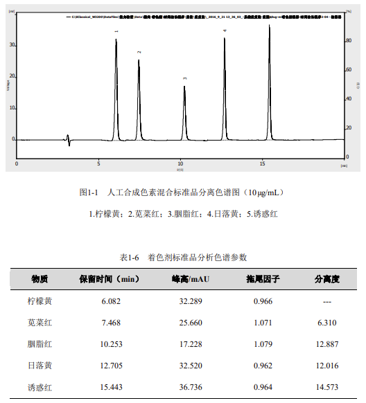 本实验参考 GB/T 9695.6-2008《肉制品 胭脂红着色剂测定》以及 GB2760-2014《食品安全国家标准 食品添加剂使用标准》,采用依利特公司生产的高效液相色谱仪,对着色剂标准品、线性以及加标回收率等进行检测方法验证,并且检测实际肉制品中柠檬黄、胭脂红、日落黄、苋菜红、诱惑红的添加情况。