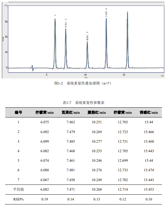 本系统的基线噪声为 25μV,根据 3 倍信噪比,仪器的小检出限分别为柠檬黄 20ng/mL,苋菜红 22ng/mL,胭脂红 33ng/mL,日落黄 20ng/mL,诱惑红 17ng/mL。根据前处理方法计算,各目标物的方法检出限分别为柠檬黄 12.5μg/kg,苋菜红 13.8μg/kg,胭脂红 20.6μg/kg,日落黄 12.5μg/kg,诱惑红 10.6μg/kg。