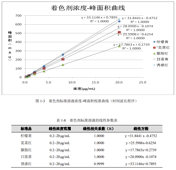 配制浓度分别为 0.2μg/mL、0.4μg/mL、0.8μg/mL、2.0μg/mL、4.0μg/mL、8.0μg/mL、20.0μg/mL 的着色剂混标工作液,按浓度由低至高进样,以标准品浓度为横坐标,峰面积为纵坐标,绘制校准曲线,着色剂的标准溶液线性相关性结果如下。