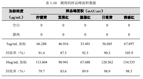 采用方法中描述的前处理过程,对空白、猪肉样品以及加标样品进行处理后,采集数据,并计算所对应的加标回收率结果见表 1-10。