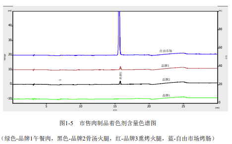 按照上述方法对市场上的几种肉制品中着色剂的含量情况分析结果如下: