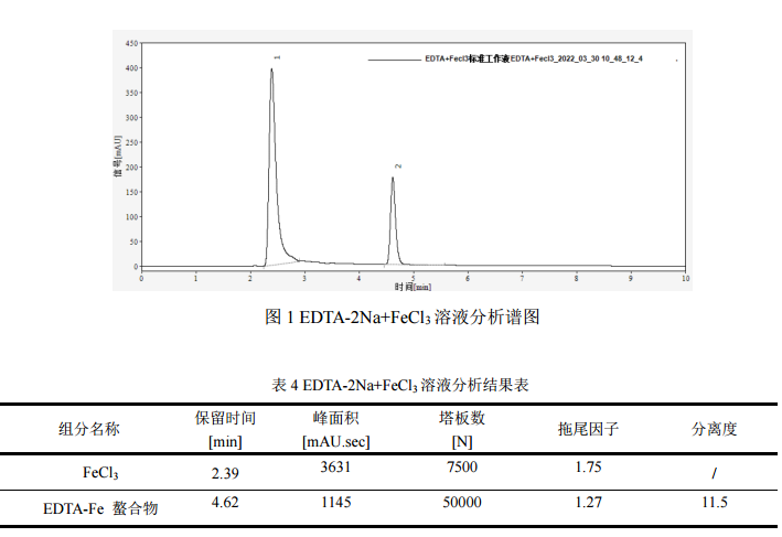 本实验采用依利特 Eclassical 3200 高效液相色谱仪搭配 SinoPak BEH AQ-C18 色谱柱对食品中的乙二胺四乙酸二钠进行分析检测,结果表明:Eclassical 3200 高效液相色谱仪稳定性较好,分析结果峰型良好、分离度优异(分离度 11.5),满足定性与定量分析的需求。