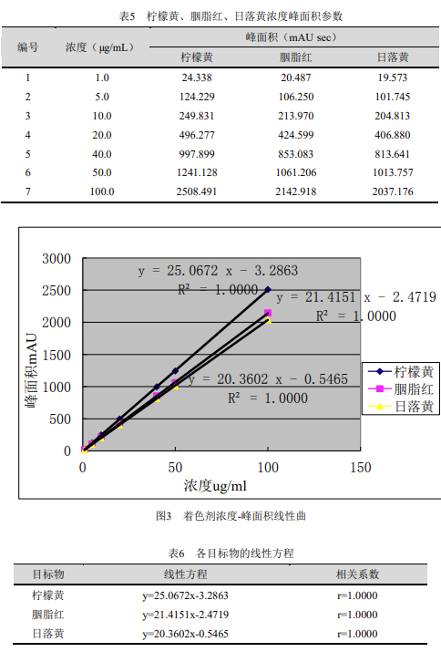 分别移取不同体积的标准储备液,配制浓度为 1μg/mL、5μg/mL、10μg/mL、20μg/mL、40μg/mL、50μg/mL、100μg/mL 的标准混合工作液,按浓度由低至高进样分析,以浓度为横坐标、峰面积为纵坐标绘制校准曲线,柠檬黄、胭脂红、日落黄的线性相关性结果如下: