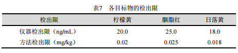 本系统的基线噪声为25μV,根据3倍信噪比,仪器的小检出限分别为柠檬黄20ng/mL,胭脂红25ng/mL,日落黄18ng/mL。根据前处理方法计算,各目标物的方法检出限分别为柠檬黄20μg/kg,胭脂红25μg/kg,日落黄18μg/kg,参见表7。