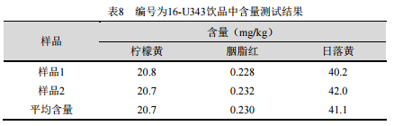 按照上述方法分析中国检验检疫科学研究院测试评价中心提供的饮品(样品编号16-U343),测试含量结果见表8。