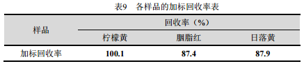 样品中加入浓度为50μg/mL的混标溶液1mL,经过处理后分析,得到的各样品的加标回收率见表9。