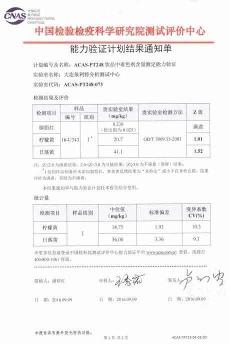 采用大连依利特公司 iChrom 5100 高效液相色谱仪,参考 GB/T 21916-2008《水果罐头中合成着色剂的测定 高效液相色谱法》及 GB/T 5009.35-2003《食品中合成着色剂的测定》并优化实验条件后,对中国能力验证中心提供的样品进行检测,结果如下: