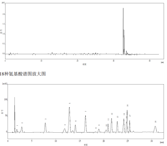高清资料:18 种氨基酸混标分析高清谱图(含各氨基酸峰标注、保留时间详情)、实际培养基样品检测原始谱图;