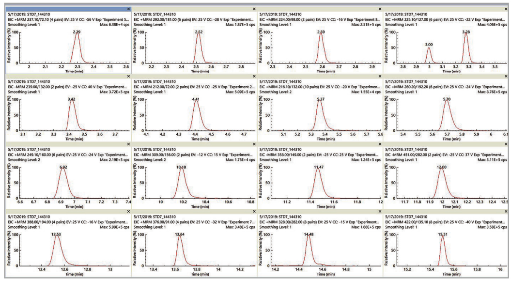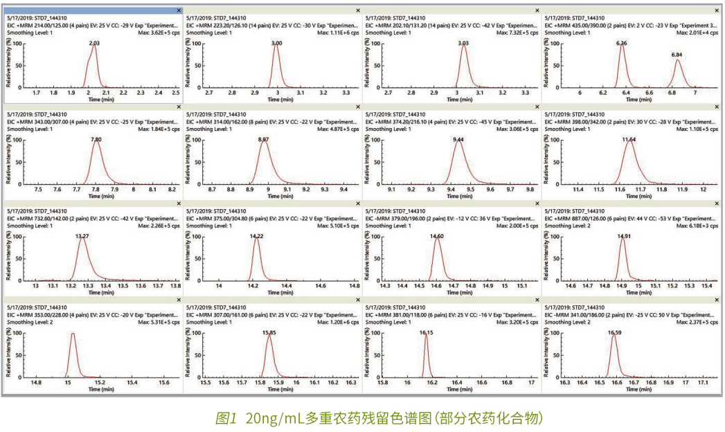 在上述实验条件下得到数种农药化合物的 MRM 色谱图,见图 1。