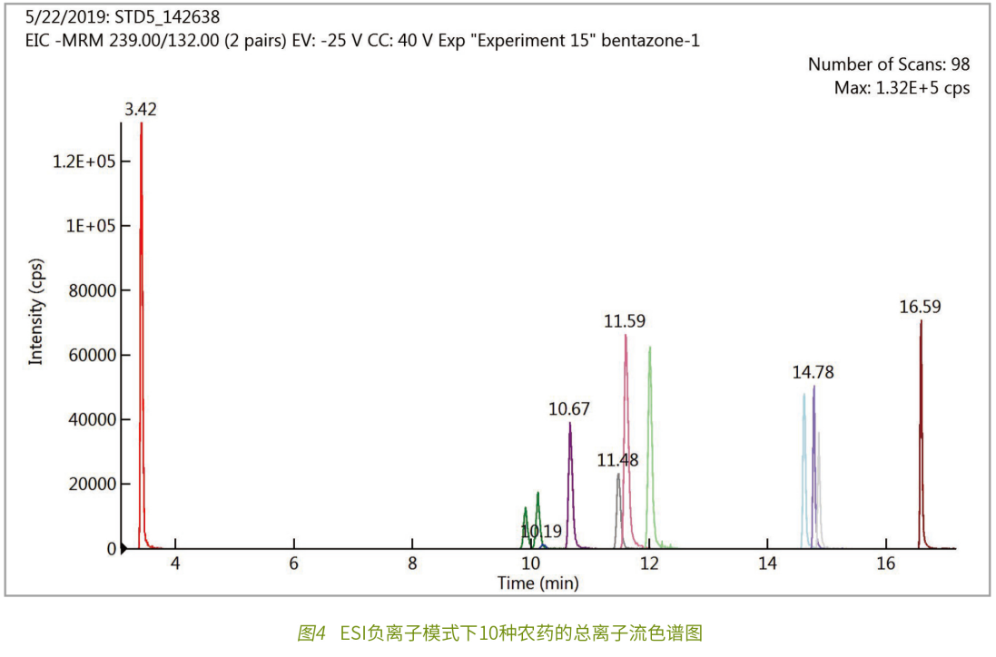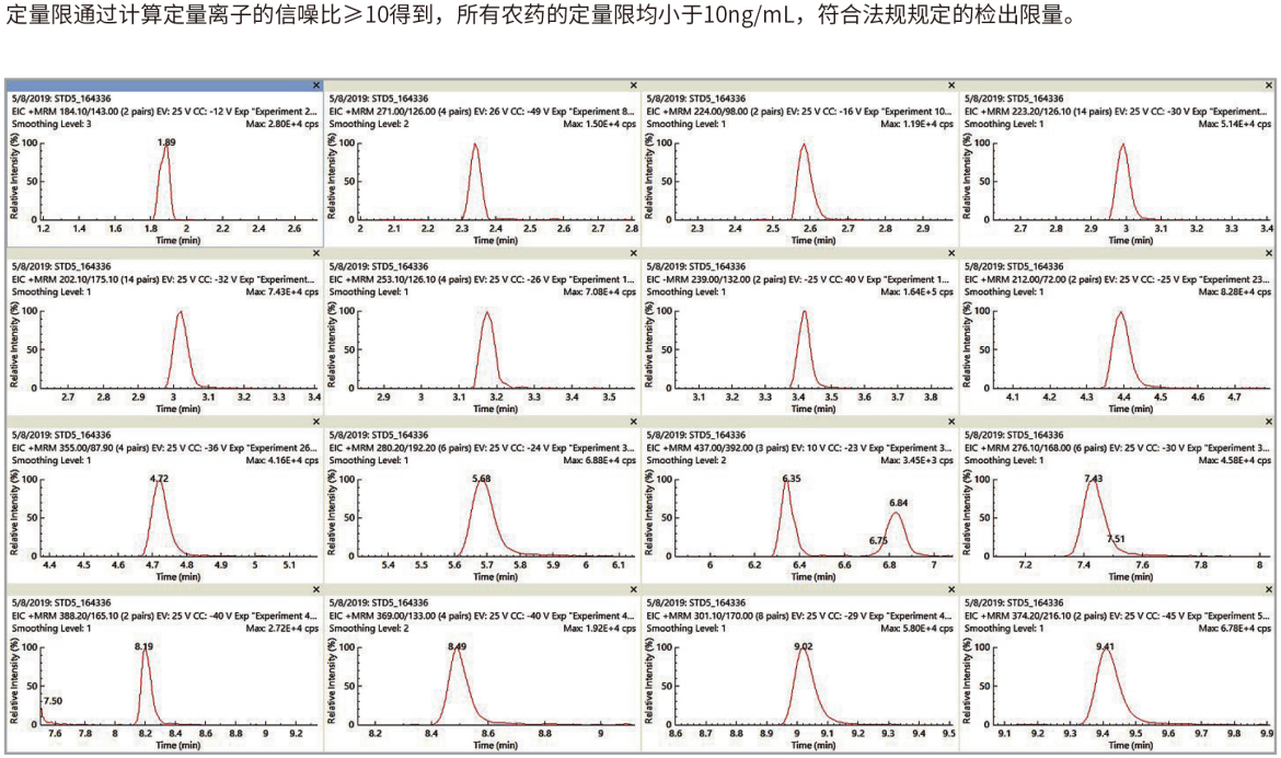 随着现代农业的发展,农药使用越来越普遍和频繁。带来高产的农产品的同时,也给环境和人类的健康带来负面的影响。由于抗药性、农药价格和环保健康等因素,农药的使用越来越呈现多种农药联合使用,不同季节轮换使用等新的方式,因此农药检测就不仅只是局限于某种或者某类化合物,而是更广泛的筛查各类农药残留的可能性。在食品安全会议的议题上,农药残留往往是大家先关注的,某些高附加值的经济作物如茶类更是需要严格监控农药残留的残留状况。近年,消费者越来越重视环境?;?,消费者转向关注农药使用与残留量,无农药残留的有机农产品更是受到消费者的青睐。因此法规日趋严格并注重多种农药残留的同时检测。本文参照台湾食品药物管理署 TFDA 公告之食品中残留农药检验方法 — 多重残留分析方法 (五) 建立多重残留农药之检测方法,EClassical 3200L-MS2 Vertical 9100 液相质谱联用系统应用于农产品中 203 种农药多残留正负模式同时检测 LC-MS/MS 分析方法。