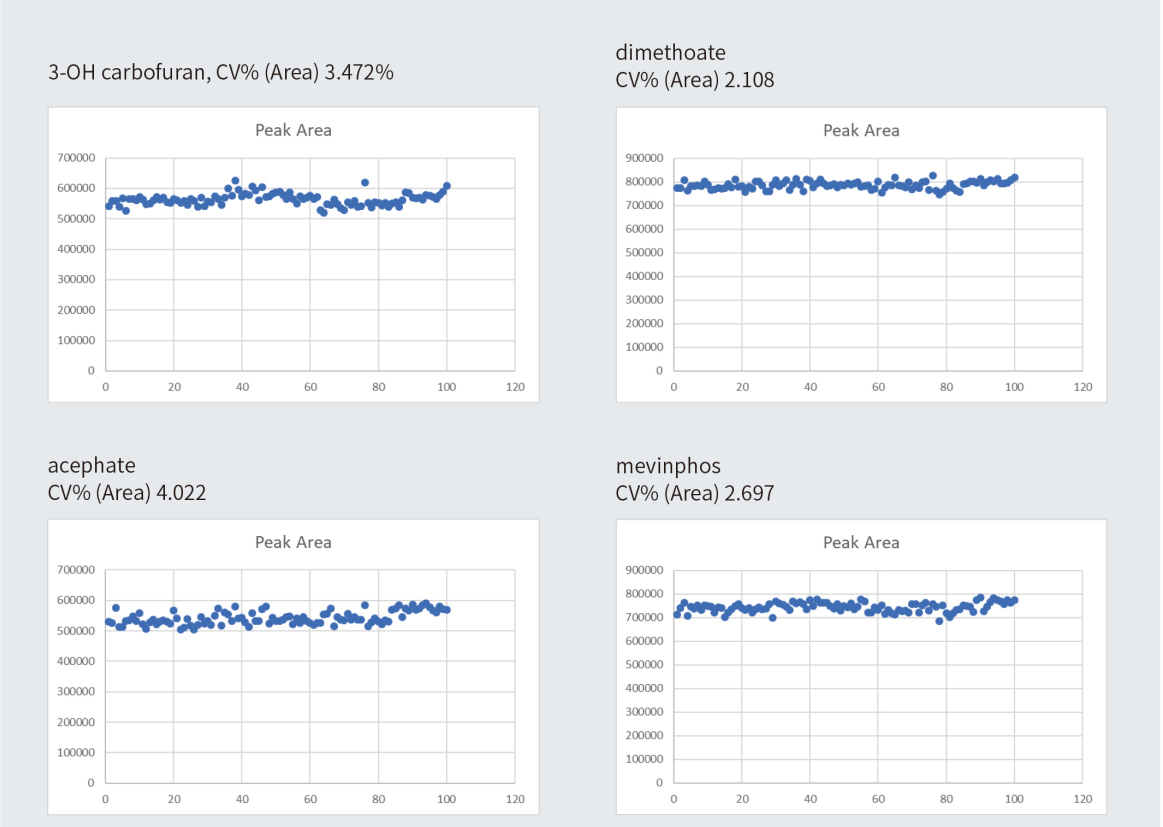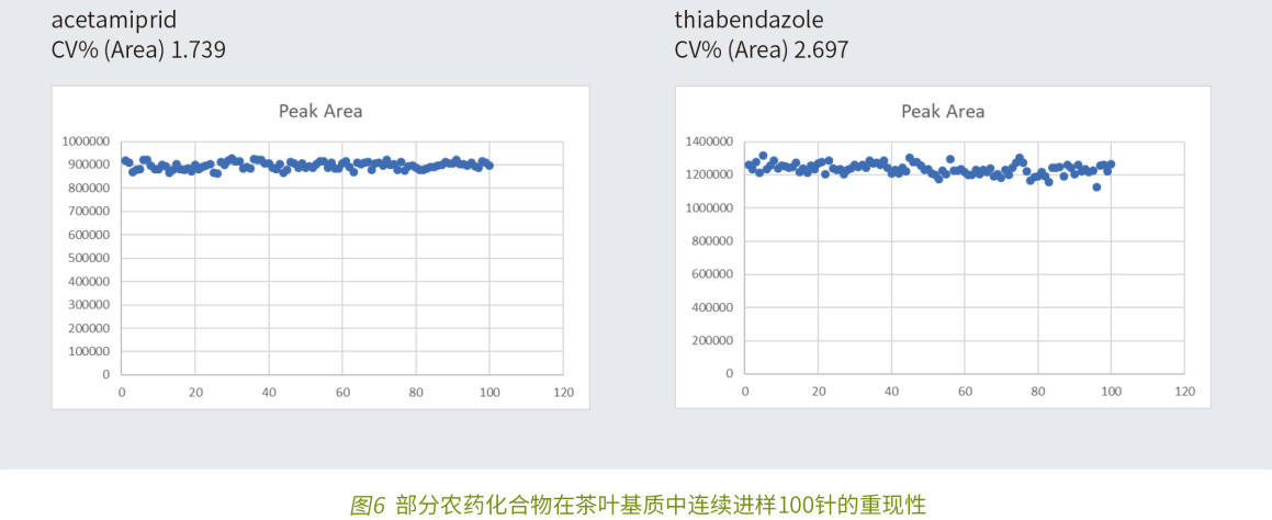 面对农产品检测越来越多样和复杂的检测样品,三重四极杆质谱的稳定性和抗污染能力对于仪器的使用和维护来说也是非常重要的内容。以待测样品中常见而且非常复杂的茶叶基质为例 (见图 5),基质加标浓度 20ng/mL 连续进样 100 针,测试 MS2 Vertical9100 的耐脏性能。图 6 展示了部分农药在 100 针进样条件下峰面积重现性均小于 5% 的良好数据。Elite MS2 Vertical 9100 系列三重四极杆质谱具有独特的 "不怕脏、脏不怕、怕不脏" 的硬件设计:1. 带有反吹干燥气的双锥孔质谱接口结合离子源主动排放废气泵设计,具有优异的抗污染能力,长时间无需维护离子源;2.HSID 热表面诱导去溶剂质谱接口技术,320° 加热的质谱接口使得仪器有效防止样品中的复杂基质污染仪器,长时间运行免于频繁维护;3. 层流气离子导向技术,提高离子传输效率避免频繁的仪器调谐。优异的耐脏基质和污染物的硬件设计,保证满足检测灵敏度要求的同时,大程度使得仪器免于频繁?;逑春臀?,大大提高了仪器的利用效率。