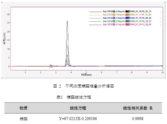 将糠醛标准工作溶液,按 2.2 中色谱条件进行分析,糠醛的线性如下表所示: