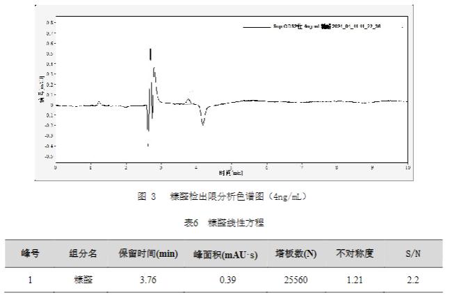 三倍信噪比计算,仪器检出限为 5.45ng/mL,方法检出限为 0.68ng/mL(0.00068mg/L),优于行业标准的 0.001mg/L。