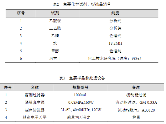 实验过程中其它玻璃器皿还包括容量瓶 (100mL、50mL、25mL、10mL)、移液枪 (0~1000μL,0~5000μL)、移液枪枪头 (1mL,5mL)、一次性 PVC 手套、一次性口罩、进样针、样品瓶、滤膜等若干。