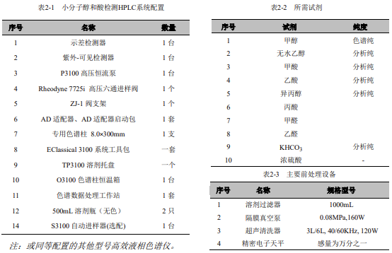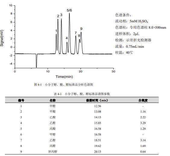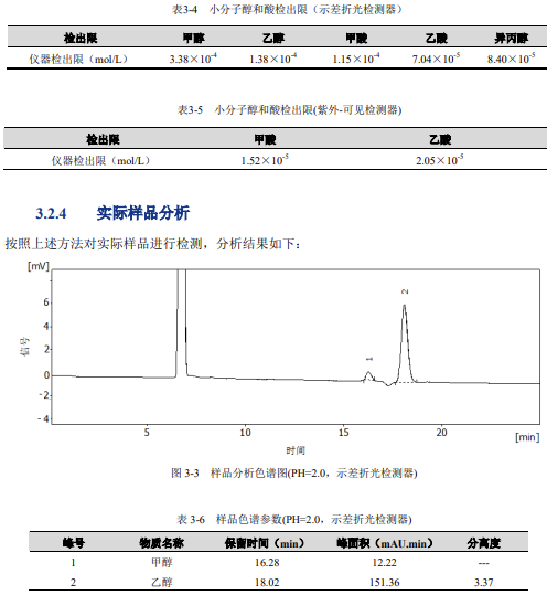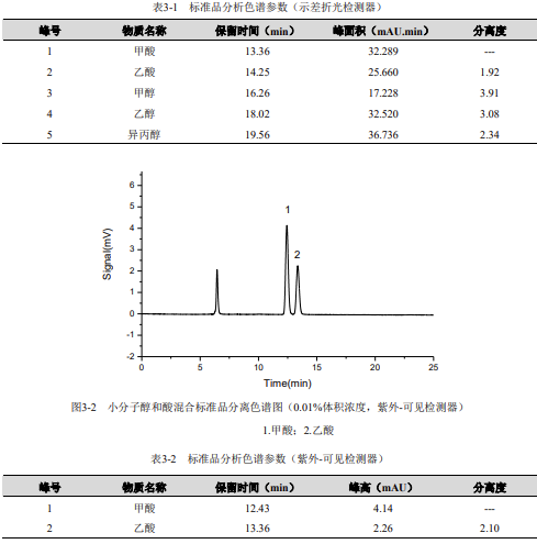 仪器设备与试剂示差折光检测器为通用型检测器,可以对所有小分子醇和酸进行检测,但其灵敏度较低,不能用于痕量检测;紫外可见检测器对绝大多数在紫外-可见光的波长范围内有特征吸收的物质均有较高的检测灵敏度;两种检测器的串联使用,取长补短,即能实现总量分析,又能完成对甲酸、乙酸等具有代表性的物质进行痕量分析的需求。