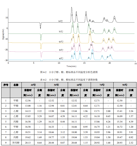 由以上结果可知,小分子醇、酸、醛的分离情况随着温度改变而改变,用户可以根据自身检测需求,选择特定温度进行实验,从而达到测定某种或者某几种小分子醇、酸、醛含量的目的。