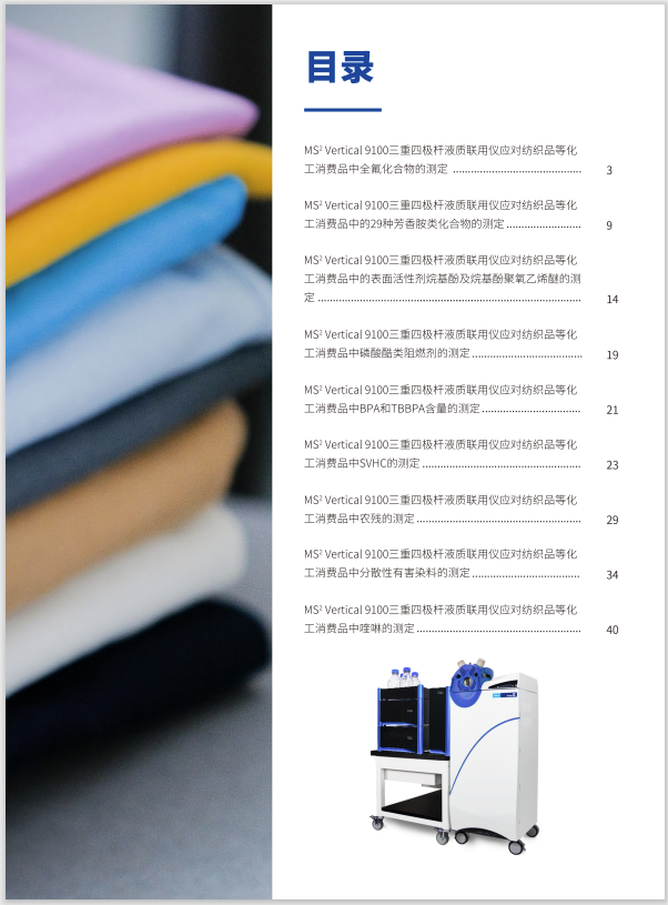 上述仅为部分核心应用摘要,文集中还包含磷酸酯阻燃剂、SVHC、分散染料等 7 类物质的详细检测方案,涵盖完整前处理步骤、仪器参数表(含所有化合物 MRM 参数)、谱图解析、方法验证数据等,可直接用于实验室常规检测。