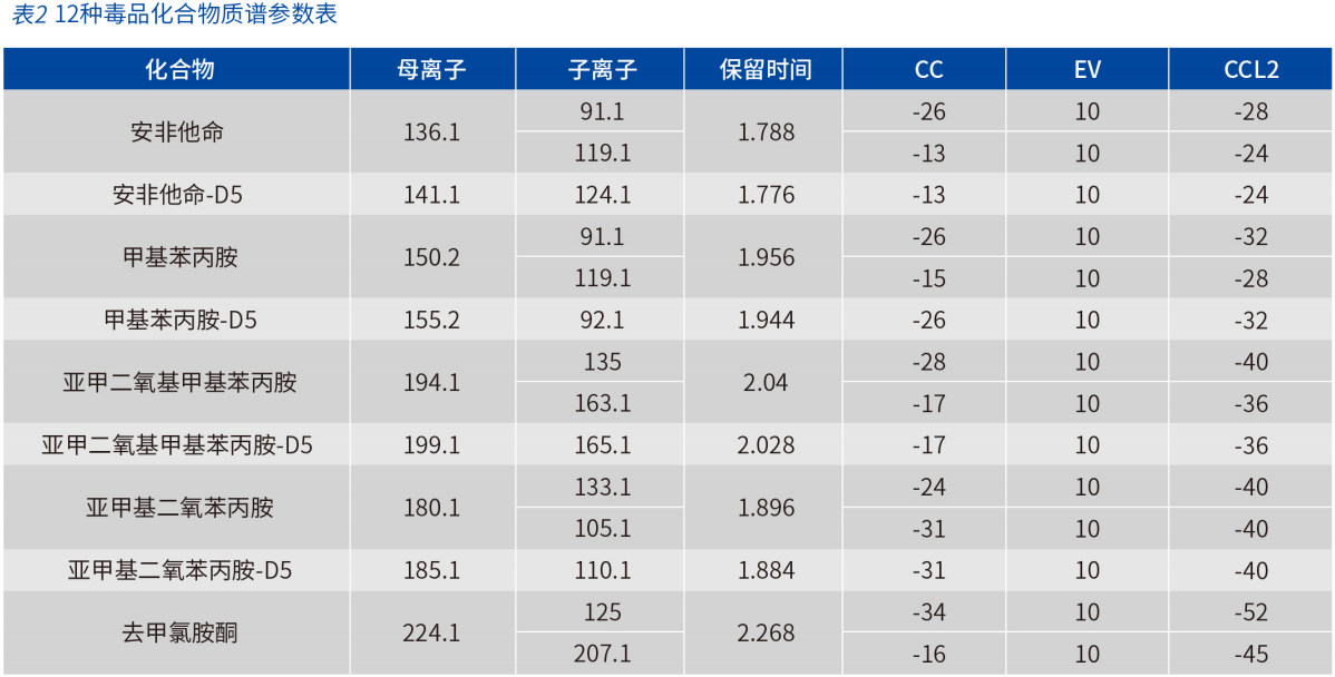 以下参数以 EClassical 3200L-MS2 Vertical 9100 三重四极杆液质联用仪为例,目标化合物质谱参数见表 2。